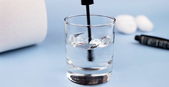 Most mascara wands are made of alcohol-safe nylon. Spray rubbing alcohol directly onto the brush, or pour some into a jar and dip the bristles in. Wrap a clean paper towel around the brush and rub and twist it to wipe away any makeup residue. Make sure you know what your brush is made of before you try this, since alcohol can damage brushes made with natural bristles. You may be able to find the material listed on the packaging, if you still have it. Some makeup pros recommend doing this before every application of mascara. However, most dermatologists recommend washing or disinfecting your brushes every 7-10 days.