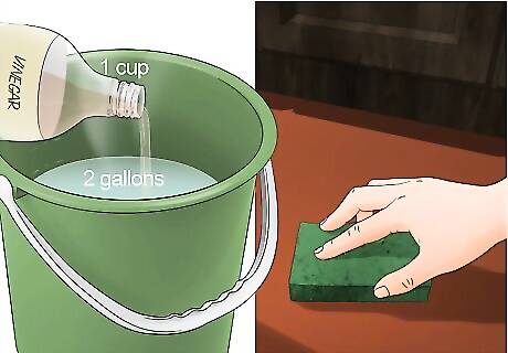 Attend to the toughest spills with a vinegar solution. Mix 1 cup (237ml) of vinegar with 2 US gal (7.6 L) of hot water. Use a kitchen sponge to rub the solution into more tenacious stains. You can keep this solution stored to handle any future spills. Another option is to use a 1:3 mix of window cleaner and water or Simple Green cleaner.