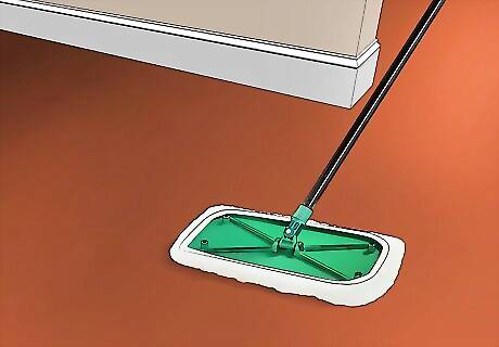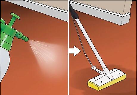 Sweep the floor with a dust mop or vacuum it. The best size mop for this purpose is between 24 to 36 in (61 to 91 cm) long. All home improvement stores should carry these mops. Sweep or vacuum from one end of the floor to the other; this should get rid of anything not stuck to the floor, such as dirt, dust and leaves. Vacuuming may work best for getting dirt and debris out of small crevices in the floor.