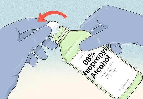 Wet a cotton ball or static-free cloth with the alcohol. After putting on your gloves, uncap the alcohol. Place the cotton ball or cloth over the top of the bottle. Turn the bottle upside down for about a second. Return the bottle to an upright position and replace its cap.