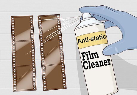 Spray the negatives with antistatic film cleaner. If the cloth didn't do the trick, spray one squirt of cleaner onto a nonabrasive antistatic cloth. Gently move the cloth over the surface of the negative. Use light back-and-forth strokes until all dust, watermarks, and/or fingerprints are gone. The cleaner will dry immediately. You can buy it at your local photography supply store. Antistatic film cleaner emits potent, potentially toxic, fumes. Make sure your workspace is well ventilated. Wear a mask for extra protection.