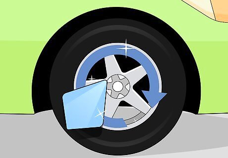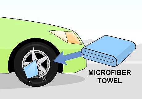 Dry off the rims. When you’ve finished cleaning all four rims, use a microfiber towel to remove leftover moisture from the rims. To remove water from tight spaces, such as the lug nut holes, you can try compressed air, a leaf blower, or a quick drive around the block. Make sure you note which rags you’ve used on the wheels. These may have gathered brake dust, which will scratch your car’s paint. Save these rags for wheel cleaning only.