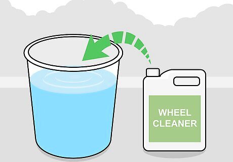 Mix soap into the water. Add a teaspoon of wheel cleaner for every gallon (3.79 L) of water. Wheel cleaners can be found at general stores or automotive stores. You may instead use a neutral pH, non-abrasive detergent such as Dawn. Remember to stick to an all-purpose cleaner unless you know what type of wheel and rim you have. Aluminum is the most common rim variety, but there are also others, such as chrome. In addition, there are various wheel coatings that can be worn away by using the wrong cleaner.