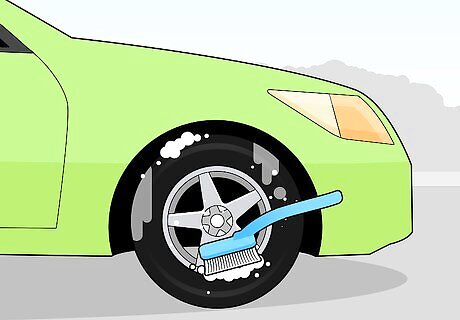 Rinse off the brush when it gets dirty. As you scrub, you will notice your scrubbing tool gathering soap and debris. Dip the brush in a bucket of clean water to clean it. Make sure all of the soap and debris is gone before you return the brush to the soap mixture. By not rinsing your scrubber, you may reintroduce brake dust, snow salt, and other grime which can permanently discolor or even corrode your rims.