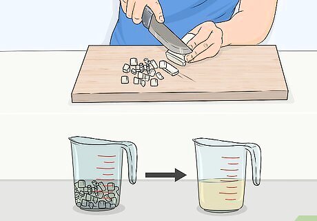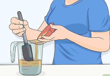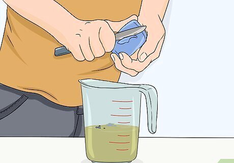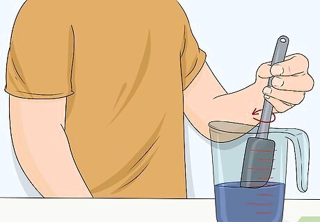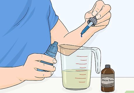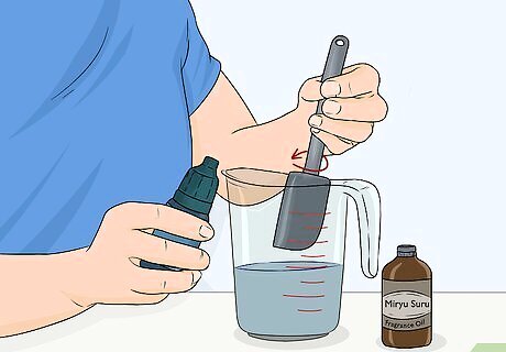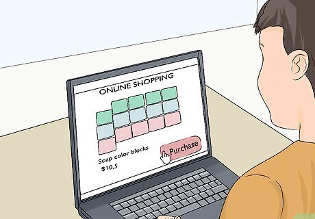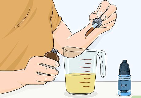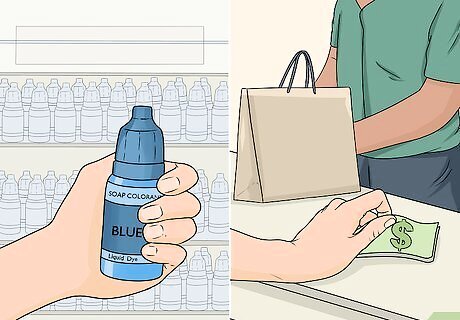 Purchase a liquid dye specifically formulated for soap making. You can buy liquid dyes for soap making at a craft store in the soap making aisle. Do not use fabric dye or dye meant for candle making. They are not the same thing and are not skin-safe. Some liquid dyes need to be mixed with distilled water first. Read the instructions that came with the dye to find out how to do this and what amounts to use.