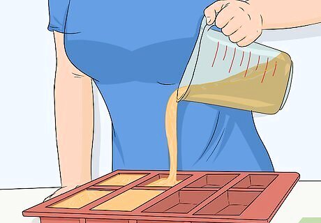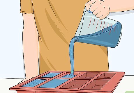 Pour the soap into the molds, then allow it to dry and cure, if needed. How long this takes depends on what type of soap you are making. Melt and pour soap is ready to use once it hardens, but cold process soap requires a curing time. Melt and pour soap is ready to use in about 2 hours. Just pop it out of the mold and lather up! Cold process soap requires about a week to harden, and then 4 to 6 weeks to cure.