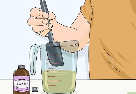 Mix in any desired fragrance oils or essential oils. Essential oils are natural, but if you choose to use fragrance oils, they must be labeled for soap making. A couple of drops is all you really need, but check the label to find out how much you need as each fragrance/brand is different. Use a stainless steel spoon or a rubber spatula to slowly stir the fragrance into the soap.