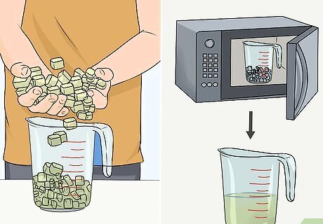 Melt a batch of melt and pour soap. Cut your soap base into chunks, then put the chunks into a glass measuring cup. Microwave the cup for the time recommended on the soap packaging, about 1 minute. You can melt as much soap as you want, depending on the size and amount of your molds. Most soap making molds state how much soap they need to be filled. You don't have to use a professional, loaf-style mold for this. Craft stores sell lots of unique molds for individual soaps.