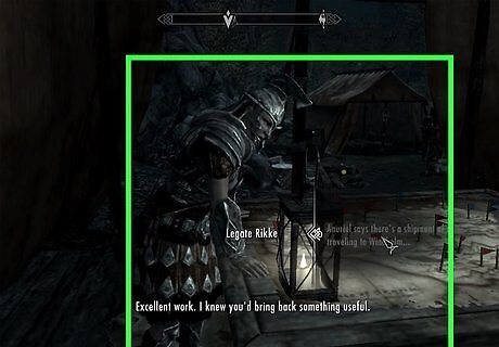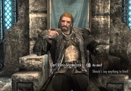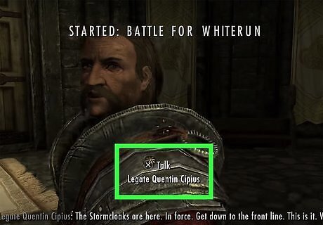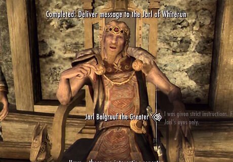 Deliver a message to the Jarl of Whiterun. General Tullius will hand you a note after completing “The Jagged Crown” quest to be delivered to the Jarl of Whiterun. You can find the Jarl within Whiterun in Dragonsreach. Deliver the note to the Jarl and he will give you an axe for you to deliver to Ulfric. Travel to the city of Windhelm (east and marked on your map) and find Ulfric in the Palace of the Kings. The Palace of Kings can be found straight ahead once you enter Windhelm. Ulfric will tell you to take the axe back to the Jarl and to expect a ton of excitement for Whiterun. Return to the Jarl in Whiterun, who will take back the axe and ask you to speak with Legate Quentin Cipius, who will inform you that the Stormcloaks have arrived at Whiterun and intend to take the city. You can find Quentin within Dragonsreach,
