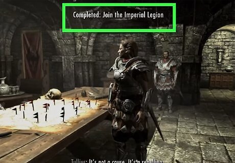 Join the Legion in Solitude. If you decide to side with the Legion, head to Solitude located in the northwest part of Skyrim and speak with General Tullius inside Castle Dour. General Tullius will point you towards Legate Rikke, also in Castle Dour, and hand you some work to prove your usefulness. Legate Rikke will give you the task of clearing out bandits from Fort Hraggstad, west of Solitude. Once you have cleared out the fort, head back to Legate Rikke and take the Imperial Legion oath. Tullius will direct you to the castle’s blacksmith, Beirand, to pick up your Imperial armor. The bandits can be easily killed, but make sure to bring plenty of health potions to heal!