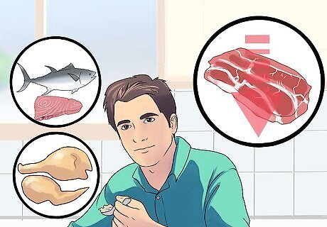 Limit red meats and increase the amount of fish and skinless poultry you eat. Look for wild-caught fish, such as salmon, cod, haddock and tuna. These fish are good sources of omega-3 fatty acids that are essential for your health and are anti-inflammatory. The skin of fish and poultry is avoided because it can be high in animal fat, as well as any added hormones and antibiotics. This promotes inflammation.