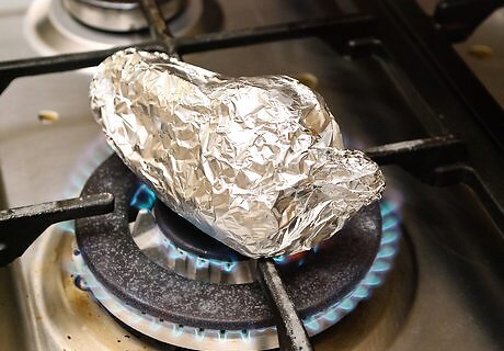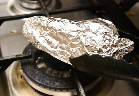Turn your gas stove burner to medium heat. Since you are using a direct flame, you don't want the heat to be on high. Wrap each pepper in a double layer of aluminum foil. Seal the foil tightly and make sure there are no openings. As the pepper roasts it will leak out juices. You won't want these to leak onto your burner, so the foil is necessary to prevent leaks as well as to prevent the pepper from charring too much.
