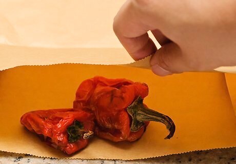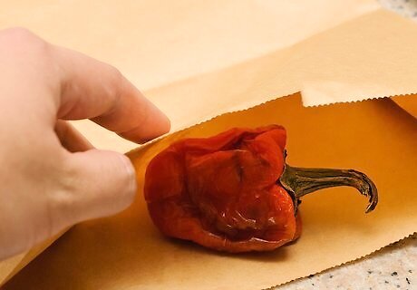 Steam your peppers. You will need to do this so the skins come off easily. The skins will be mostly charred so you will need to remove them before you use them in a dish or eat them. Put the peppers in your paper bag. Roll the top of the bag to seal it. Allow the peppers to steam for 15 minutes before taking them out of the bag.