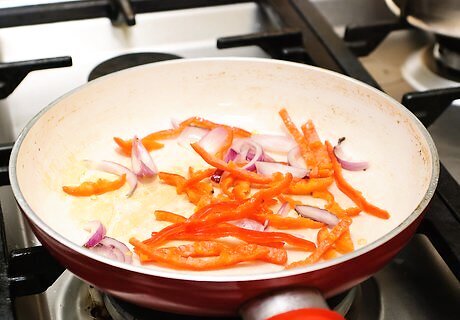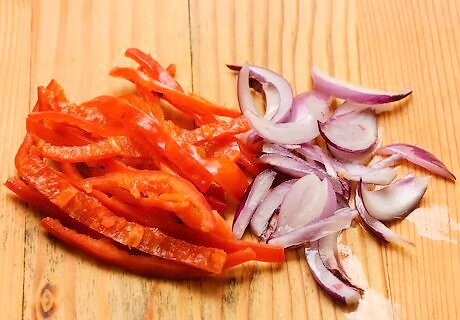 Sauté peppers and onions together. This basic preparation is often used to top sandwiches, quesadillas, pizzas, or as a filler in vegetable lasagna. You will need the following simple ingredients to prepare sautéed peppers: 1 red bell pepper, seeded and cut into strips 1 small white onion, thinly sliced 1 tablespoon of butter 2 tablespoons extra virgin olive oil Pinch of kosher sea salt