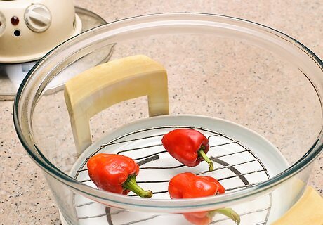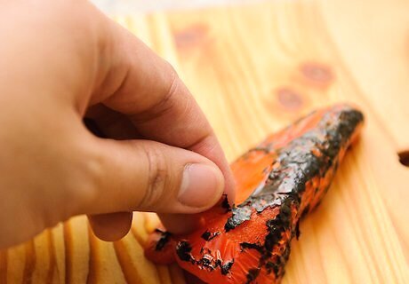 Remove the peppers from heat when they are fully roasted. You will now steam, seed, and peel them as with the other roasting methods. Put the peppers in a paper bag. Let them sit in the closed bag for 15 minutes. Remove the peppers from the steamer bag and cut them vertically. Spread each pepper out into one large piece and remove the stem. Wipe away any seeds with a towel. Flip each pepper over and peel away any skin.