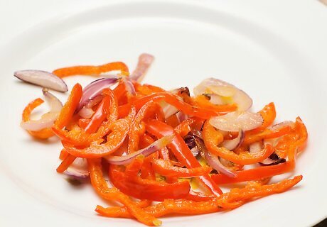 Serve the sautéed peppers and onions. You can use these as a simple side dish. You can also put these on sandwiches, pizzas, and in quesadillas. This basic preparation is also a popular topping for steaks and chicken. You can prepare these ahead of time, storing them in the refrigerator for later use.
