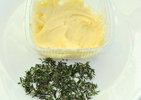 Soften the butter and chop the thyme. Remove ½ cup (1 stick) of butter from the refrigerator about 2 hours before beginning this recipe to give it time to soften. Strip the leaves from several sprigs of thyme. Chop them finely until you have about ¼ cup (32 g) of thyme. If you can’t wait 2 hours, microwave the butter in 15-second increments until it is soft enough to work with.