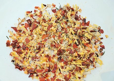 Add some heat with a spicy thyme rub. De-stem 2 dried chiles de árbol and pulse them in a spice or coffee grinder until they are finely ground. Put the ground chiles in a small bowl and add 4 teaspoons (20 g) of coarse sea salt. Spread 4 teaspoons (20 g) of finely grated lemon zest on a piece of parchment paper and microwave it for 1 minute. Then: Add 4 teaspoons (20 g) of fresh thyme leaves to the parchment paper and microwave until the lemon and thyme are both dry, about 90 seconds. Let the lemon and thyme cool, then lightly crush them together. Add the lemon and thyme to the salt and chiles and mix it thoroughly. Use the mixture as a dry rub for roasts or chicken.