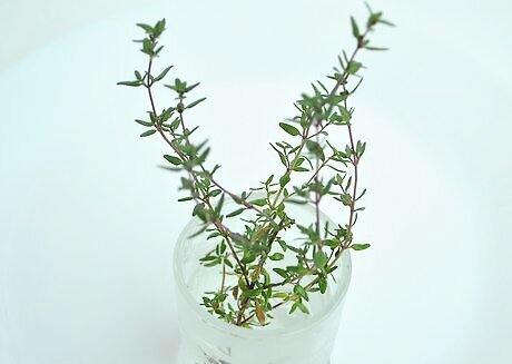Put fresh thyme cuttings in a glass of water to preserve them. Cut the stems on the diagonal, then slip the thyme ends into a water glass, as you would flowers in a vase, until you are ready to use it. Place the glass in the refrigerator and change the water every other day. Thyme can be stored in the refrigerator for up to a week. Alternatively, you can wrap fresh thyme in a damp paper towel and store it in the refrigerator.