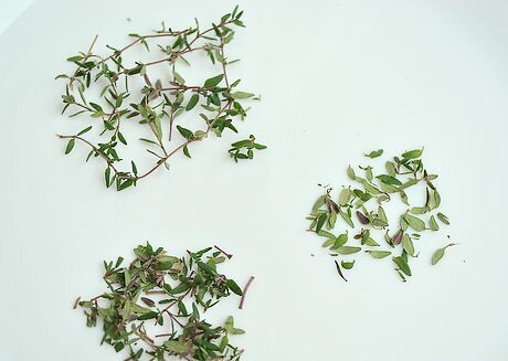 Read your recipe to determine how to prepare the fresh thyme. If your recipe calls for thyme sprigs, your washed thyme is ready to use. If the recipe calls for thyme leaves, run your pinched fingers down the stem to strip the leaves, while holding one end in the opposite hand. If the recipe calls for chopped fresh thyme, place the leafy stems on a clean cutting board and chop them into bits with a sharp knife. Remove and discard any large, woody pieces of stem.