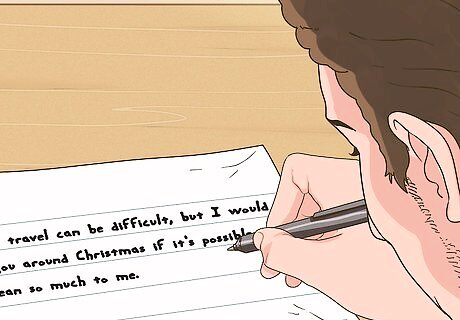 Write letters or holiday cards to loved ones. Send holiday greetings to your loved ones. Letters are great ways to communicate. You can take your time getting your words just right, and the recipient of your letter can read your words over and over again. Decorate your letter with holiday drawings. Write some of your favorite holiday memories you shared with the recipient. Let the recipient know how much you miss them and are thinking of them.