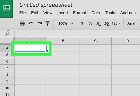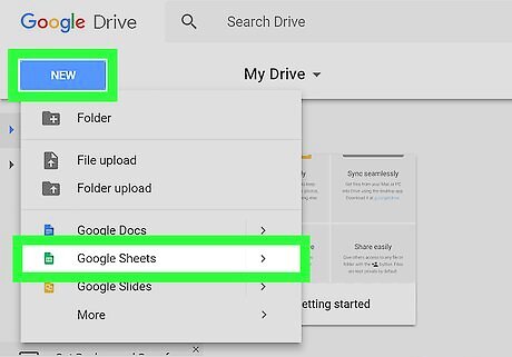 Create or open a spreadsheet in Google Sheets. If you don’t already have an existing spreadsheet open, here’s how to create a blank spreadsheet: Go to https://drive.google.com in a web browser. Click New. Click Google Sheets.
