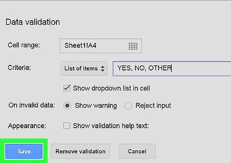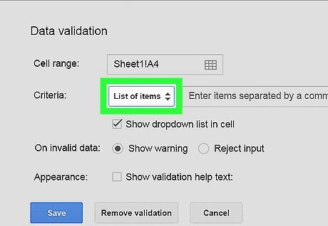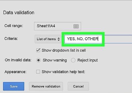 Enter the drop-down list menu items separated by commas. Each word or phrase will be a different option in the drop-down menu. For example, if you type YES, NO, OTHER into the box, you will be able to select YES, NO, or OTHER from your drop-down menu.