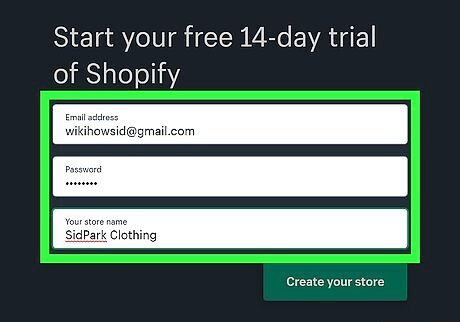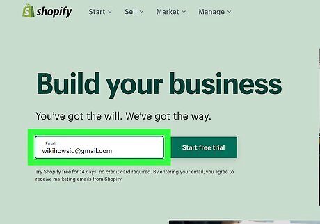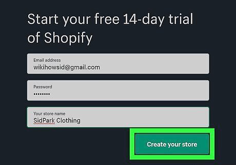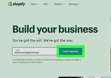 Click Start free trial. This purple button is below the text field where you entered your email address. You'll be able to try Shopify for free for 14 days without needing to add a credit card.