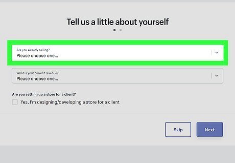 Click the drop-down arrows to answer the questions or click Skip. You'll need to answer using the drop-down menus what and how you're selling. Click Next to continue if you didn't skip.