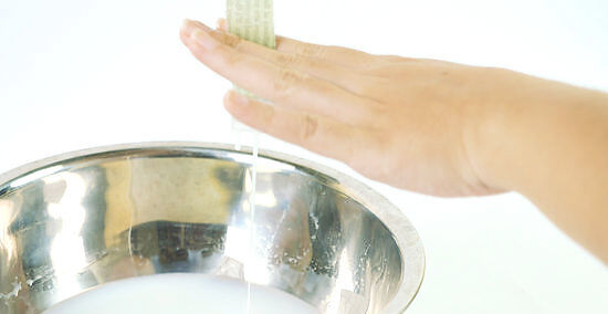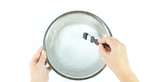 Remove any excess mixture. Do this by lightly sliding two fingers from the top to the bottom of the strip of paper. Hold it over the bowl so it drips back into the container.