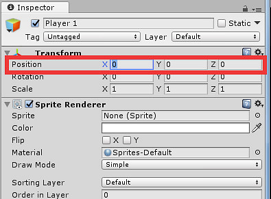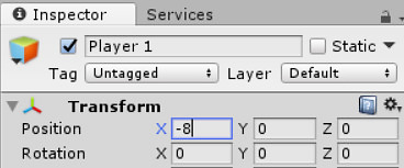Move the player more towards the left side of the screen. Click on Player 1 in the scene, and change the X value in the position to -8. ChangeTransform.png