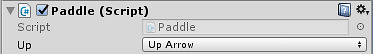 Select the Player 1 paddle. Under the "Paddle" component in the inspector, there should be a drop down menu to select up or down. Choose the keys you wish to make the player move up or down. For this example the "W" and "S" keys are used. Setkeys.png