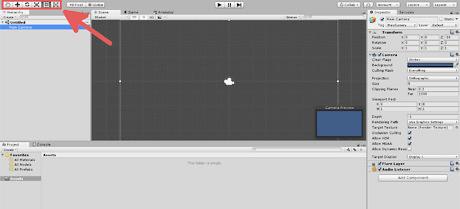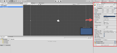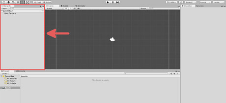 Review the left side. This is the current scene you're looking at as well as what game objects are in the scene. Currently the scene is named "Untitled" and the only object in it is the "Main Camera". This area is also referred to as the "Hierarchy".