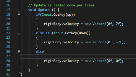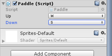 Type the following into the update function. if(Input.GetKey(up)) { rigidBody.velocity = new Vector2(0f, 7f); } else if(Input.GetKey(down)) { rigidBody.velocity = new Vector2(0f, -7f); } else { rigidBody.velocity = new Vector2(0f, 0f); } This will tell the paddle how it's supposed to move when you press up or down. Basically, if the player presses the "up" button they will move up 7 units per second, if they press "down" they will move down 7 units per second, and if they press nothing they wont move.