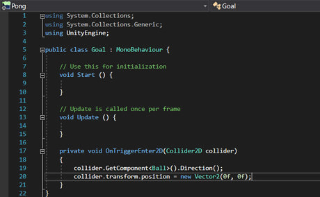 Right click in the asset folder, and click Create > C# Script. Rename the script to "Goal" Double click on the newly created script to open it. .