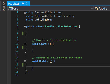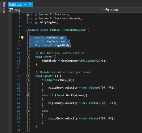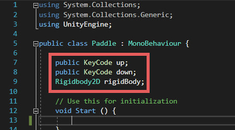 Type code above the Start() function that declares the up and down arrows, and how to move the player. public KeyCode up; public KeyCode down; Rigidbody2D rigidBody; The up and down are keys that you will set later to move the paddle up and down. Rigidbody2D is what you modify to allow the player to move. When you type new code a yellow bar will appear on the side. This shows what code was recently added to the script, and will go away once you save the script. Yellow bar.png