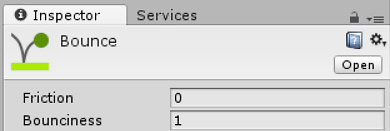 Name the material something like "Bounce." Set the friction to 0 and the bounciness to 1. This will ensure it never loses velocity. Modifybounce.png