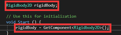Type Rigidbody2D rigidBody; above the start function, and rigidBody = GetComponent