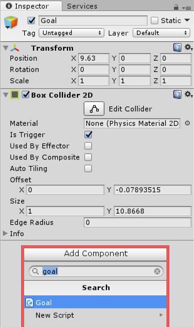 Attach the script to both goals by using "Add component" in the inspector.