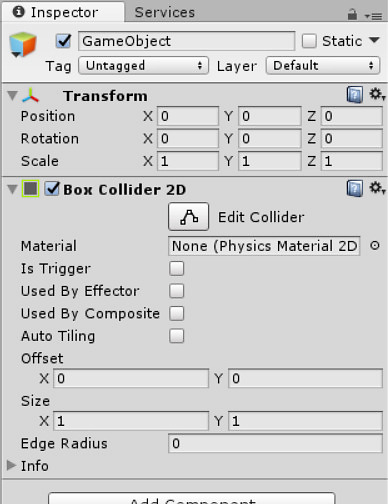 Add a Rigidbody 2D using the same process. Click "Add Component" and search for "Rigidbody 2D". Now in the inspector we're going to change some properties of the Rigidbody. Rigidbody.png