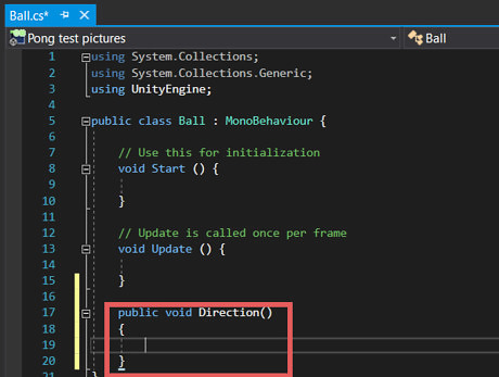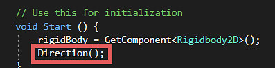 Create a function that will set the ball'ss velocity. Type the following underneath the "Start()" and "Update()" functions. public void Direction() { }