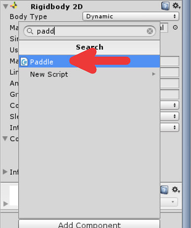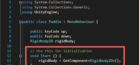 Tell the Rigidbody variable to find the "Rigidbody" that was attached to the paddle earlier. Type rigidBody = GetComponent