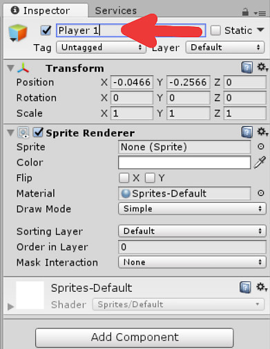 Click on the object we've just created you can see information about it on the right side. This area is called the inspector, and this is where you can modify some things about the object. Firstly rename it to "Player 1".