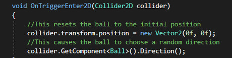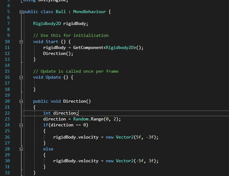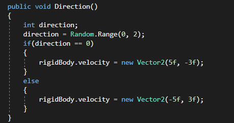 Type the following inside of the newly created Direction() function: int direction; direction = Random.Range(0, 2); if(direction == 0) { rigidBody.velocity = new Vector2(5f, -3f); } else { rigidBody.velocity = new Vector2(-5f, 3f); } This is what the function Random.Range will do for you, by generating a random number either 0 or 1. Then it will give the ball a velocity of either (5, -3) or (-5, 3) depending.