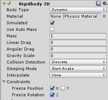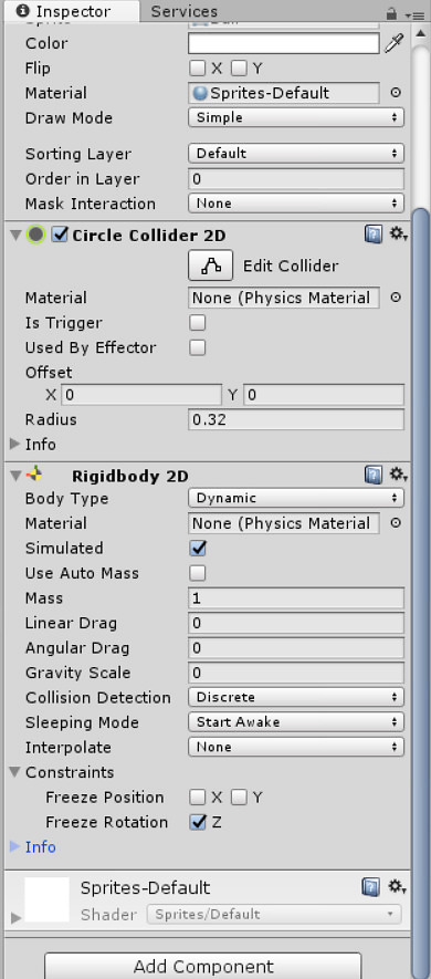 Add a Circle Collider 2D, and a Rigidbody 2D. Remember to turn the gravity scale to 0, and angular drag to 0, and finally set the rotation in the z axis to be locked.