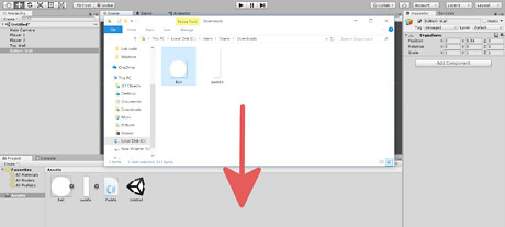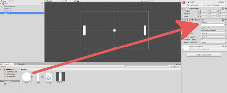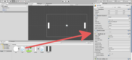 Apply the Ball script to the Ball game object. Select the ball in the hierarchy, and then drag the Ball script from the assets folder onto the Ball in the inspector.
