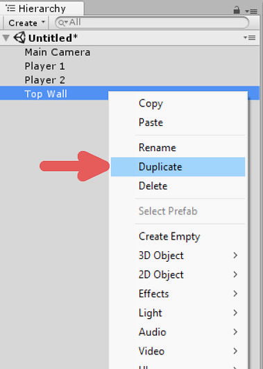 Right click on the top wall in the hierarchy, and click duplicate. Then drag it down so underneath the paddles, so that it serves as the bottom wall.