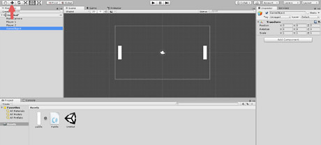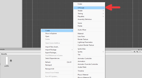 Create the script that controls the Paddles behavior. Right click in the Asset menu at the bottom, and go to Create > C# Script. Name the script "Paddle" so it's easy to keep track of it.