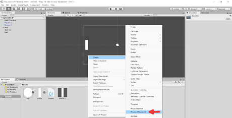 Create a physics material for the ball. This is what will allow it to bounce off the walls. Right click in the asset folder, and go to "Create Physics Material 2D"