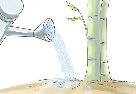 Keep the bamboo well watered. While every type of bamboo differs, and a local garden center can give gardeners more specific guidance, most bamboo like lots of water and well-drained soil. Pay attention to the plant. If the leaves start to curl, the bamboo needs more water. Pot or root bound bamboo can develop such a dense root system within a container that the root system can actually be hydrophobic or water resistant. If these root balls are watered with a traditional garden hose the water simply bounces off. The solution to this problem is to water your new bamboo SLOWLY with a trickle for several minutes each. Micro irrigation also works particularly well for all species of bamboo, and can speed up the bamboo growth cycle by as much as 1/3.